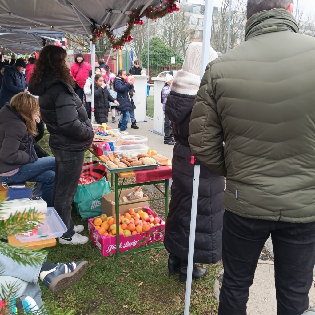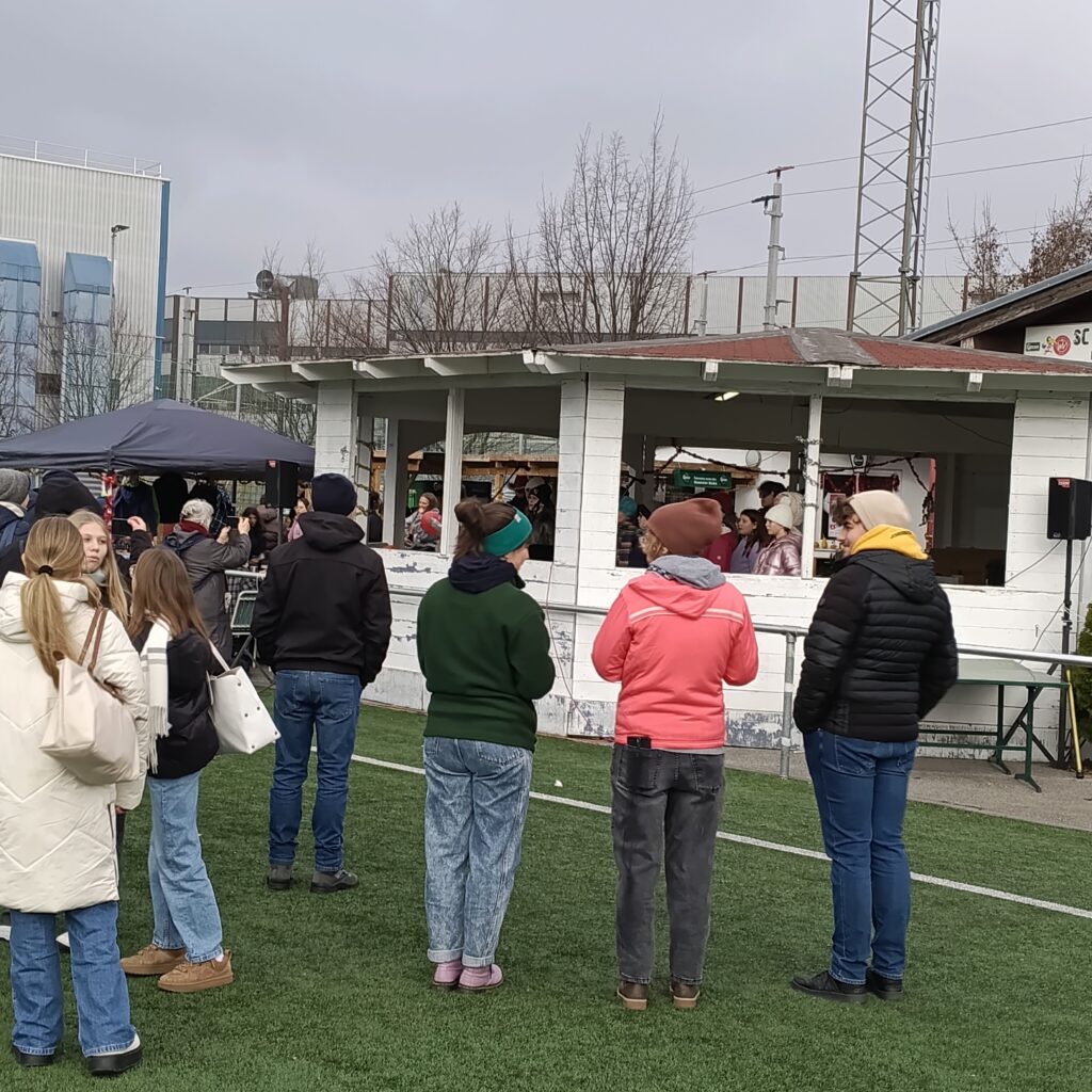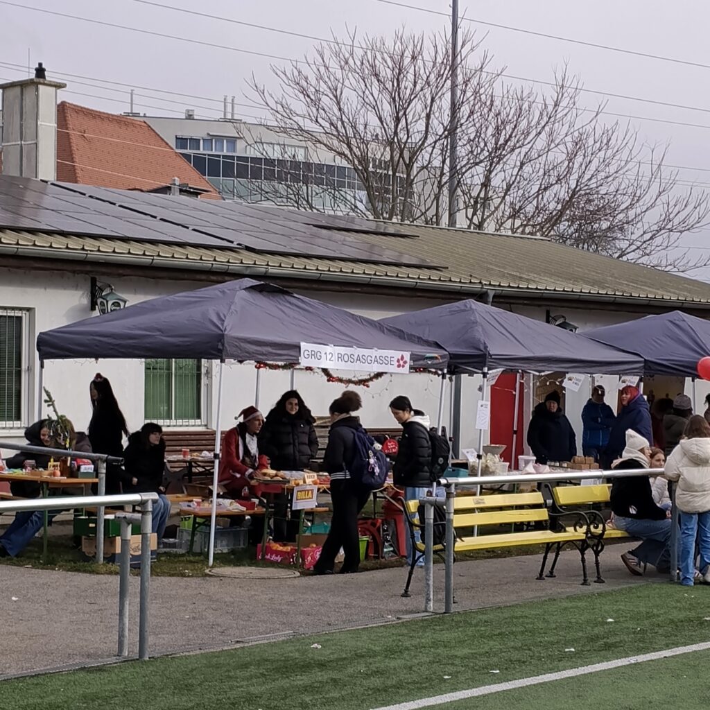 Auf den ersten Blick würde man hinter dem nüchtern wirkenden Zaun eines Sportplatzes viel vermuten – nur keinen Weihnachtsmarkt! Und dennoch sollte es einen solchen geben mit Musik, Punsch und Geschenken! Dank der Grätzlinitiative hatten sich verschiedene Schulen, Kindergarten, Soziales Wien und der SC Wiener Viktoria zusammengeschlossen, um dieses kleine Wunder zum Lukrieren von Spenden für einen wohltätigen Zweck möglich zu machen. Und mittendrin war auch die Rosasgasse mit einem Stand und viel Musik vertreten! Am 4. Dezember war es so weit. Bis dahin wurde geplant, gewerkt, gebastelt, gezeichnet, gebacken und geübt. Chor und Band der Schule gaben im Pavillon tolle Kostproben ihres Könnens und sorgten mit ihren Auftritten trotz Kälte und schwieriger Akustik für eine gute Atmosphäre, der Punsch floss in Strömen und strahlende Augen der zahlreichen kleinen und größeren Besucher zeugten von einer gelungenen Veranstaltung für einen guten Zweck: Alleine die Rosasgasse konnte rund 400 Euro für Bedürftige in Meidling an Spenden sammeln! Ein großes Dankeschön an alle Beteiligten!